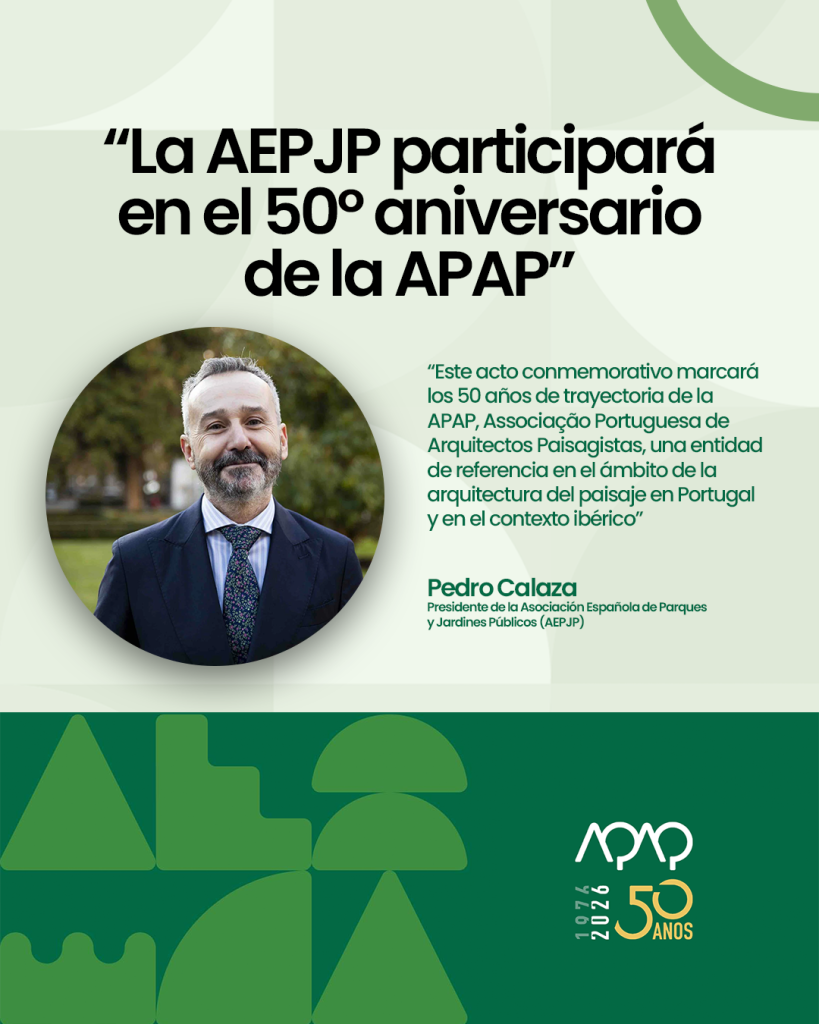 La Asociación Española de Parques y Jardines Públicos (AEPJP) estará presente en el Cinquentenário da APAP – Associação Portuguesa de Arquitectos Paisagistas, que se celebrará el próximo 3 de marzo de 2026 .